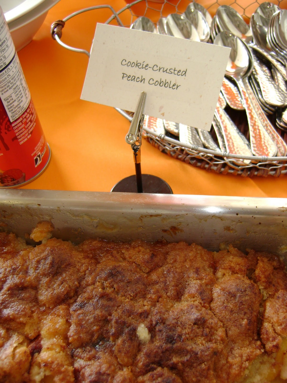 Chef Karen is not a shy woman, and she knows her food. The snickerdoodle crusted peach cobbler was her dessert contribution, and by the time I finished our interview, there wasn’t much cobbler left to sample. The crumble I had was scrumptious — sweet, firm cookie atop a tart-sweet peach slice. Can’t complain about that. I wonder if I could crash her other catering events.