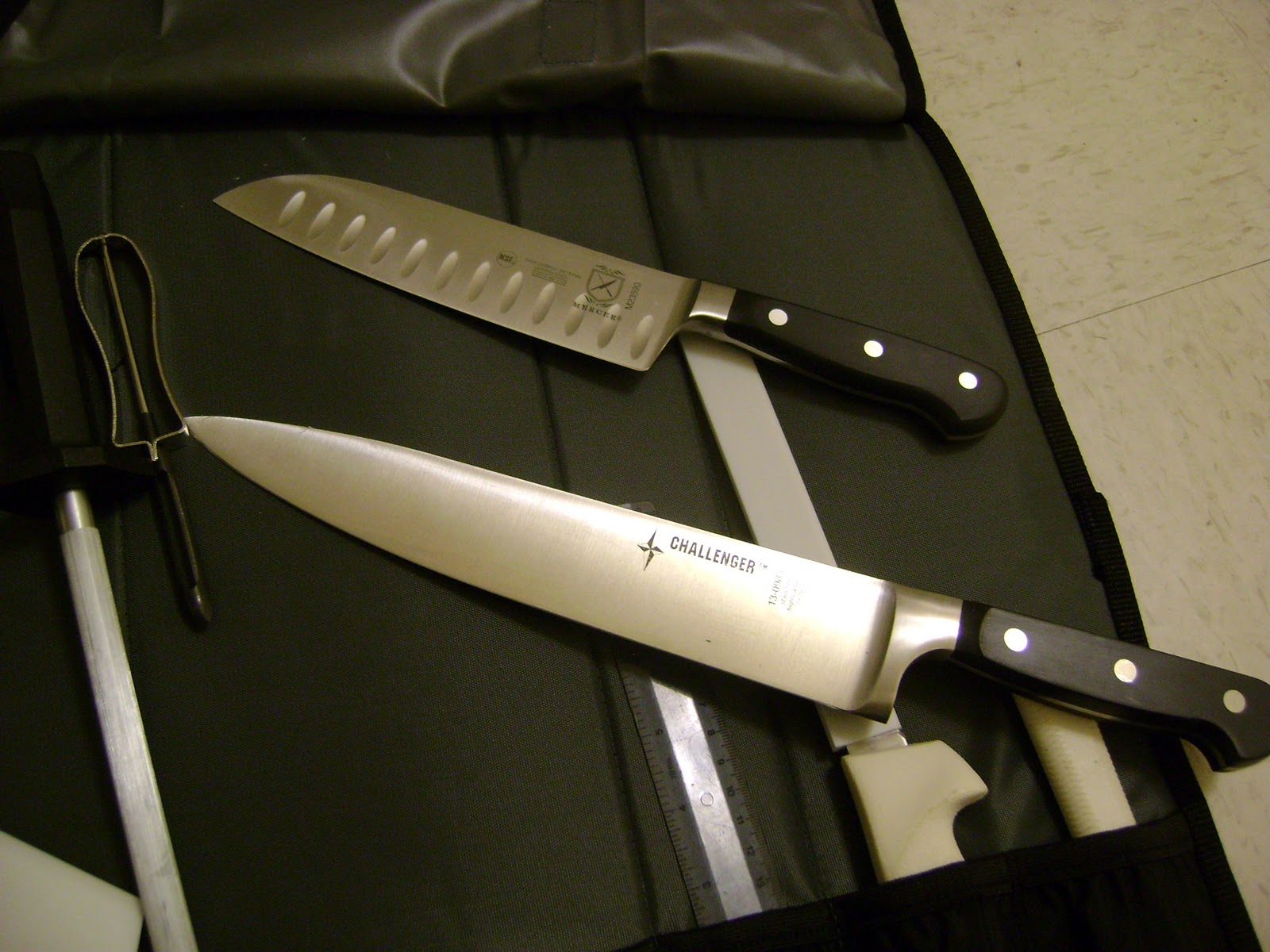 I think the hardest part about culinary school is buying the knives, which isn’t much of a hardship. Our chef gave us a few tips about knives, we watched a (very old) video about knife safety, and then Chef Gregg showed us all of his knives. I wish I’d had my camera. He had one of those three-compartment red tool kits filled to the brim with knives, carving tools, peelers, trimmers, knives, and more knives. He had scimitar for carving large cuts of meat, he had pairing knives for making fancy garnishes, and he had more slicing knives than I could think of uses for. Inspired, we students set off to City Kitchens, Seattle Cutlery, Bargreen Ellingson, and the Seattle Restaurant Store and came back laden with knives.