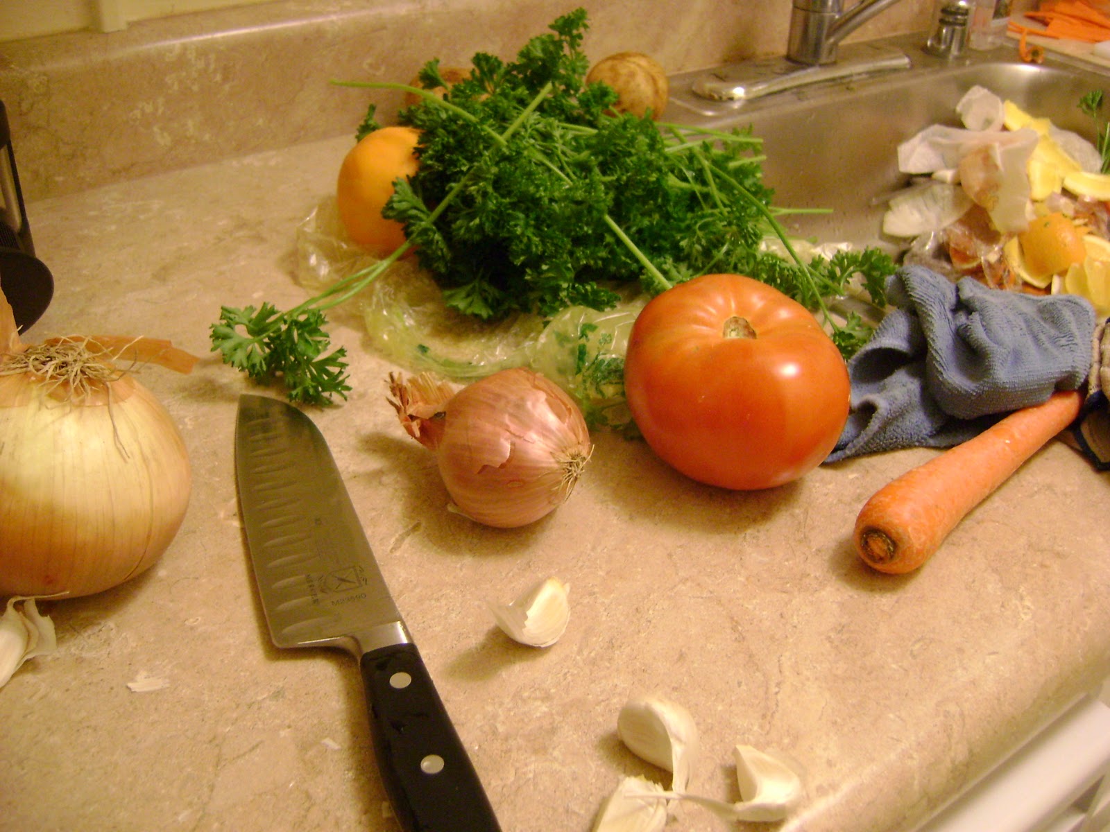 Remember the story told about Julia Child who worked so hard to get her cuts correct that she chopped onions for hours and hours until she got them right? Well, that’s sort of what I ended up doing. I bought 10-pound bags of onions, potatoes, and carrots. I also bought lots of tomatoes, garlic, onions, shallots, and oranges. It took me a while to figure out what to do with the oranges, but I also made lots of mashed potatoes, potato casseroles, tomato sauce, and even a roasted, pureed carrot bisque. Pretty tasty, all around.