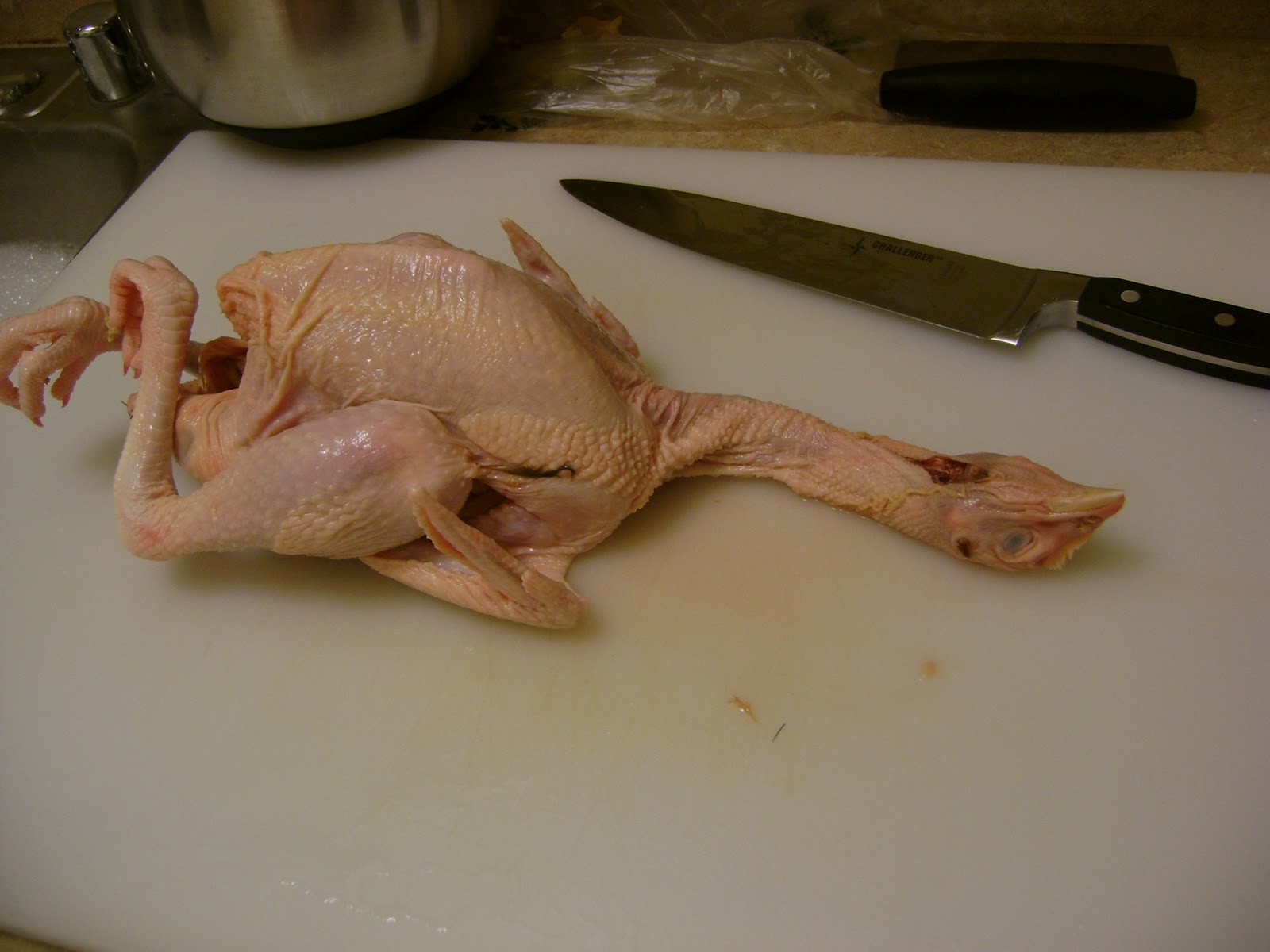 Because we’re in culinary school, we get to participate in various catering events. Two classmates of mine, Rob and Kevin, and I were invited to help out at the Museum of Flight, which was hosting a special event for Boeing. Chef Takeyuki Suetsugu, the owner and chef of Bistro Satsuma in Gig Harbor, was hired to cater the traditional Japanese dinner, and he brought one chef, two assistance, a team of servers, one culinary chef instructor (Chef KG) and three culinary arts first quarter students. Crazy? Maybe. Fortunately, he already had most of the food cooked, and “all” we got to do was slice and plate. The catered event lasted about 4 hours, but it really felt like 15 minutes. That was so fun, and he was so organized that it was easy.We had a chance to dabble in chicken fabrication, too, and that was soooo much fun. There are a few specific ways to fabricate chickens, and we were practicing the 8-way. I usually cut a chicken like you carve a turkey, but that didn’t turn out to be the right way. We practiced cutting the chicken by removing the backbone first and then cutting it apart. Our exam for second quarter involves cutting apart a chicken and producing specific cuts, so this hen is my next nemesis. I found her at Viet Wah, an Asian market in the International District. I have to say, looking at an animal’s head and feet definitely roots you in what you’re eating. I removed the head, feet, and the leftover pin feathers. Then it looked like any Tyson (sorry Chef Karen and Chef Sarah) chicken. I didn’t do too well cutting out the backbone the first time, because I didn’t crack it evenly in half (fellow culinary experts, you’d know what I was supposed to do), but there’s plenty of time before I take that test. I hope I won’t have to buy hundreds of chickens, but I know that frozen chicken breasts are off the menu.