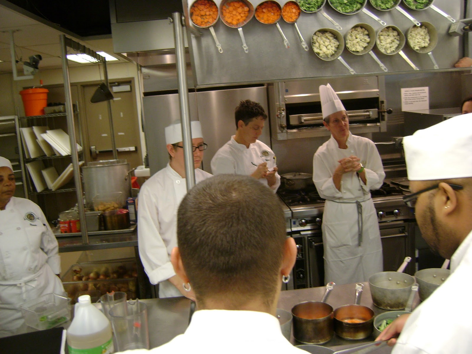 One of the most interesting lessons we had was about the effects of time, temperature, and pH on certain foods. Some foods’ colors become enhanced when they are cooked in acid, and some foods’ colors turn “off,” such as becoming duller or completely different. Chef Vicky McCaffree was substitute teaching for Chef Gregg because he was in Italy for the Slow Food Conference. She is teaching the 3rd quarter class now, because Chef Greg Atkinson has left to pursue some other work. Chef Vicky prepared four different types of vegetables – orange, white, green, and cabbage green – four different ways – correctly, for too long of time, with vinegar (acid), and with baking soda (alkaline). The results were amazing. Our whole class got up and watched while she cooked the ingredients, and a few students even helped out.